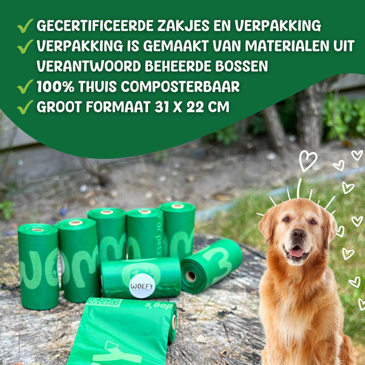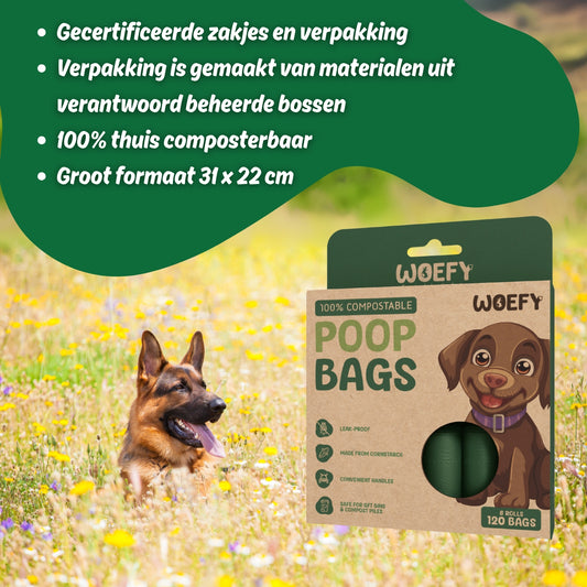 Of je nu kiest voor een compacte verpakking van 120 stuks of een extra voordelige bulkverpakking van 600 stuks: bij Huisdierpaleis.nl vind je altijd de juiste poepzakjes voor jouw hond. Bestel eenvoudig online en draag samen met Woefy bij aan een schonere en duurzamere wereld.